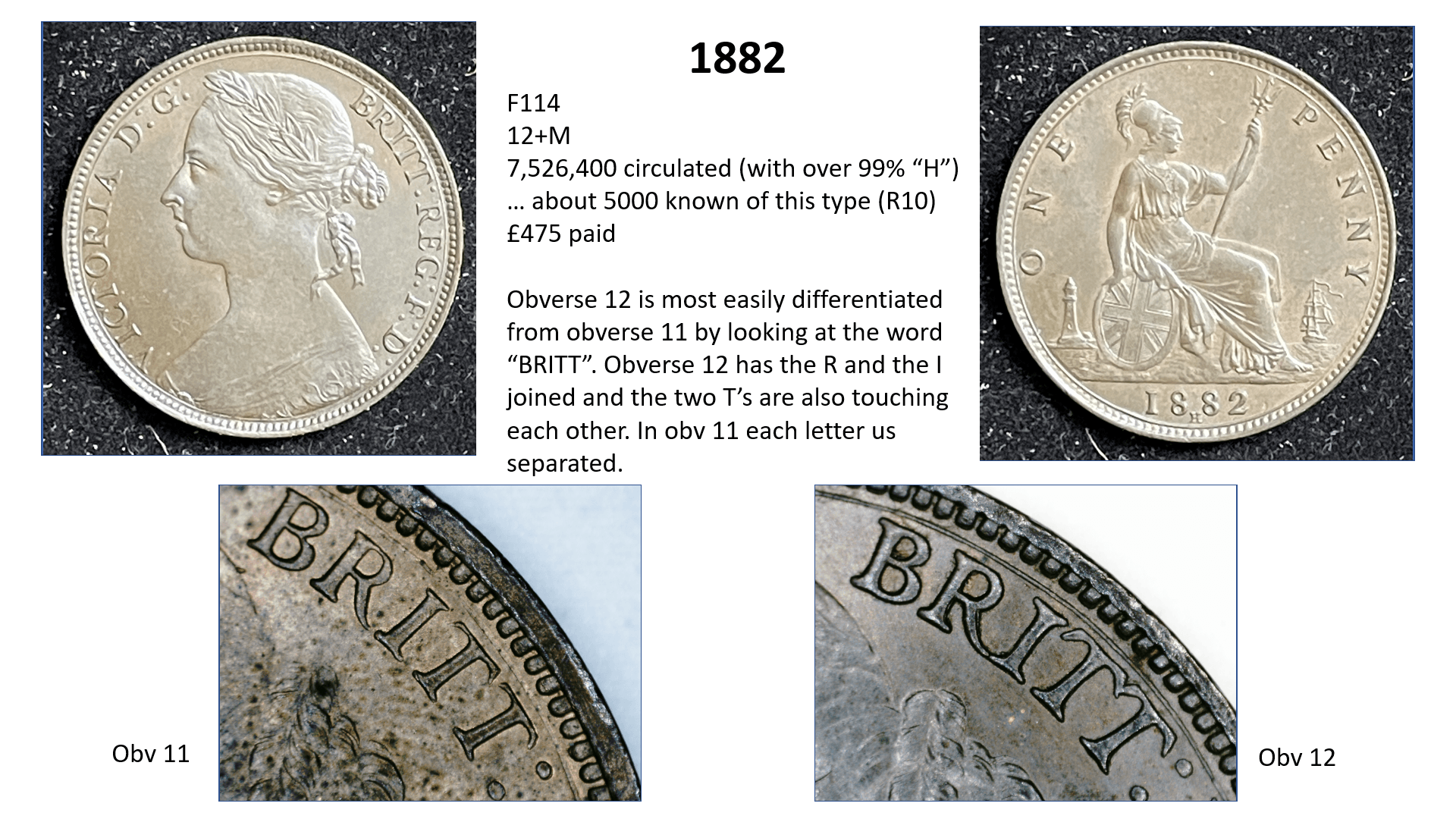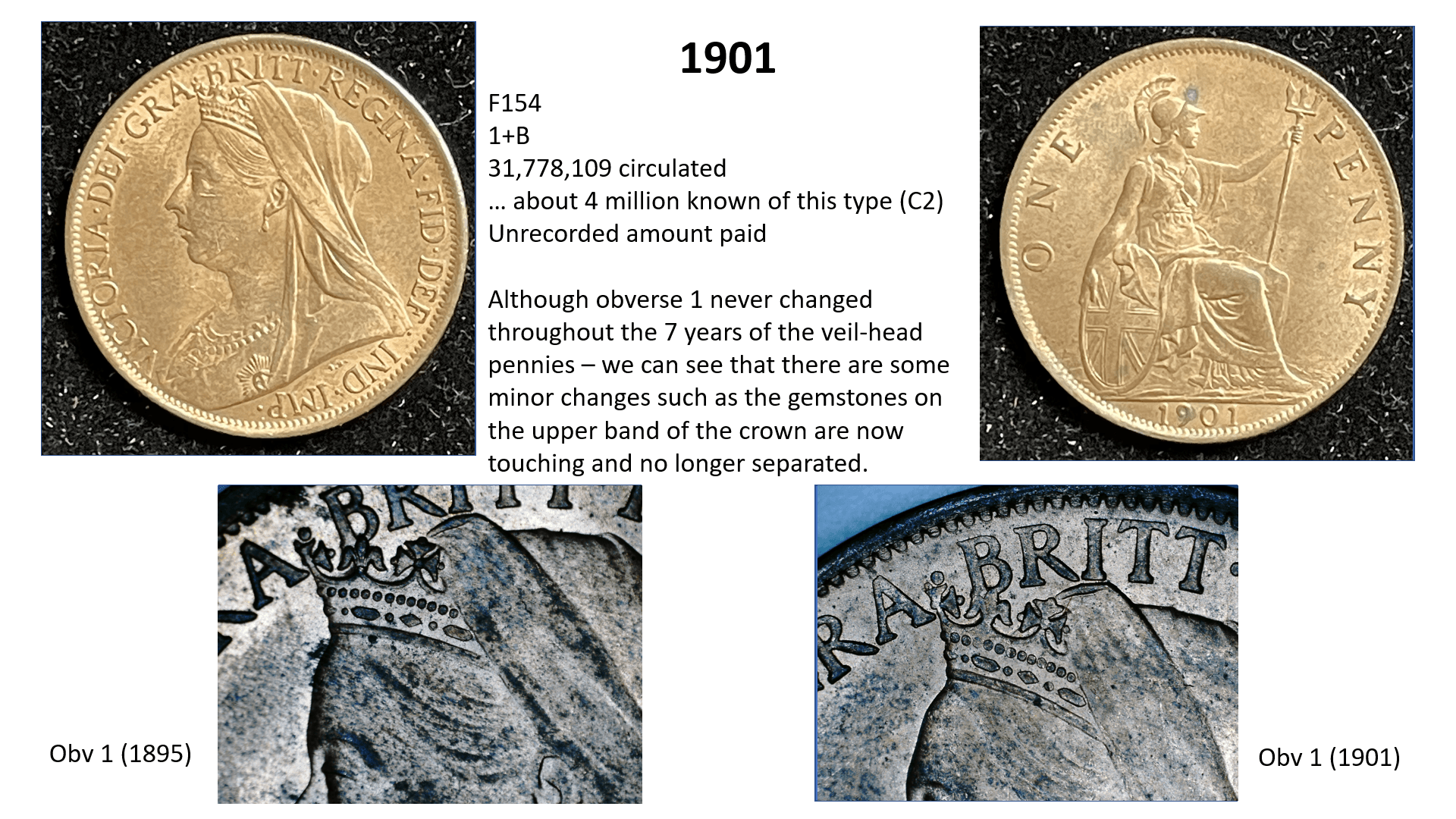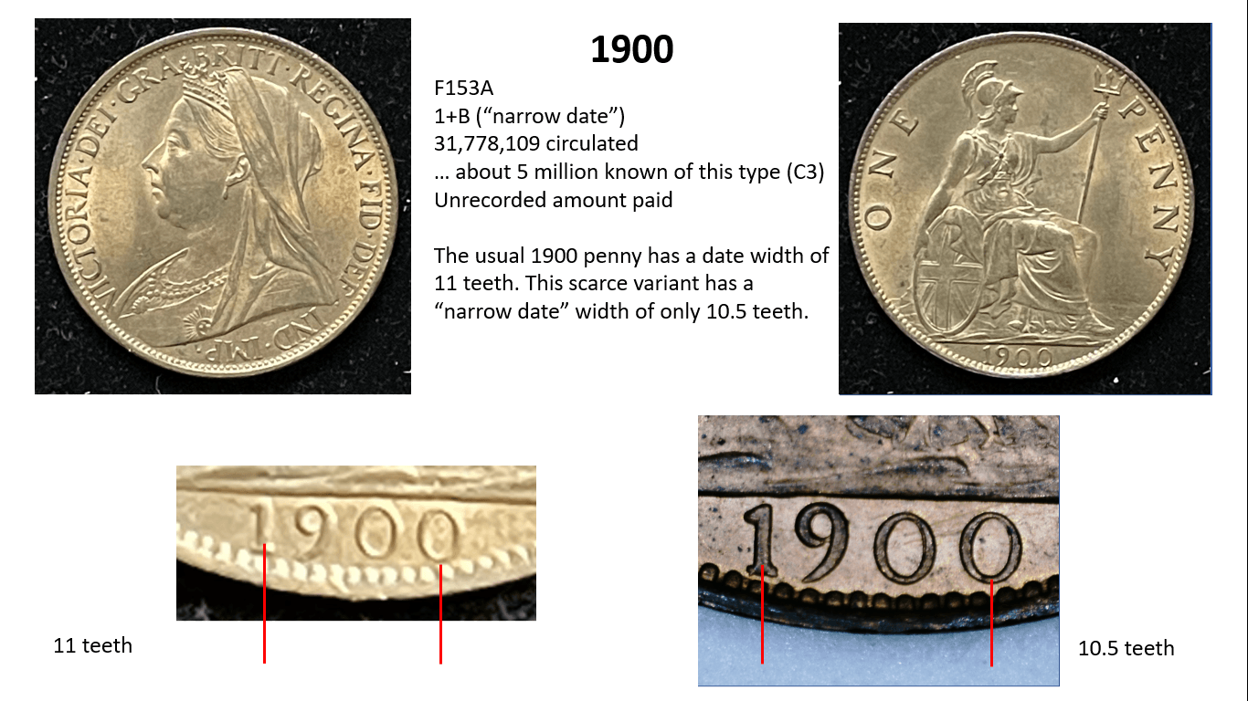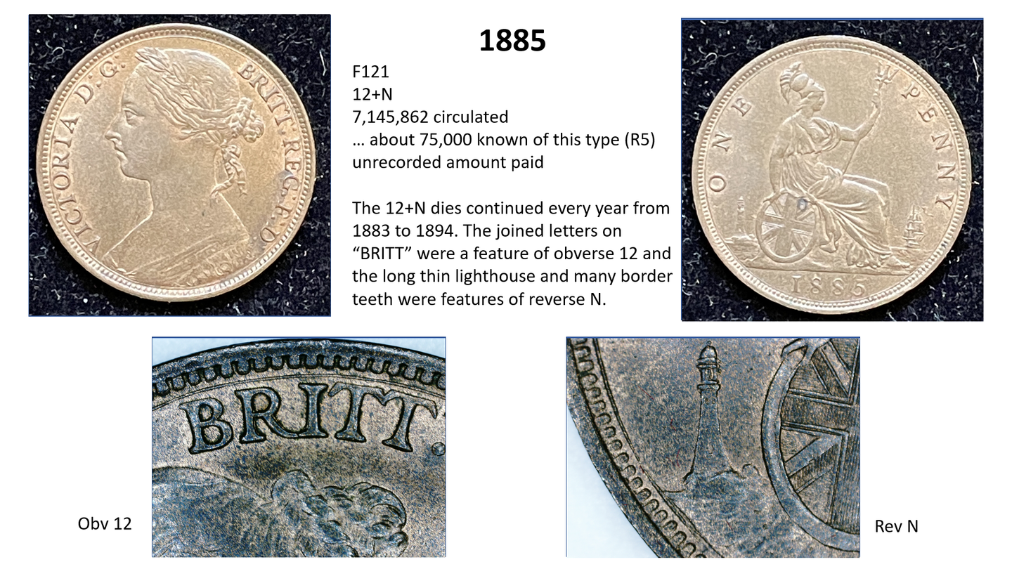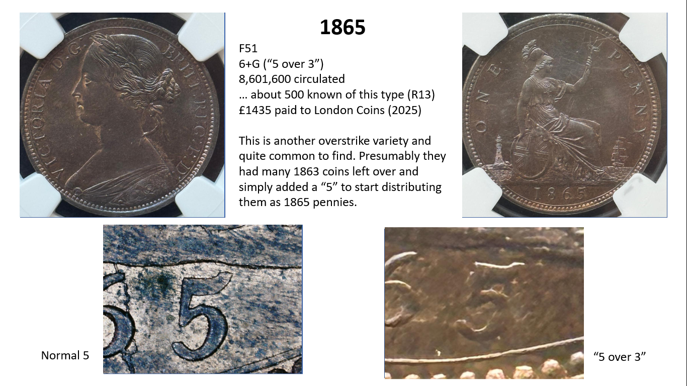 side of the penny (ie the date side). So for example, the 1860 pennies have 6 different types of obverse (1 to 6) and 6 different types of reverse (A to F) with many combinations of varieties therefore, but other years such as 1967 have only one variety (3+J). This gets even more complicated when some new variations are later discovered…….so for example in 1860 we have a 1*+A as well as a 1+A, but these do not occur often.
