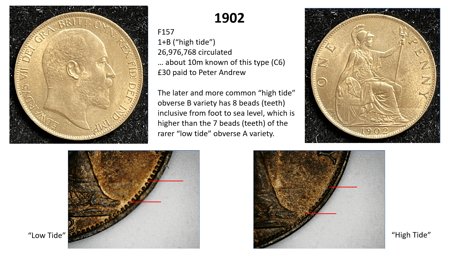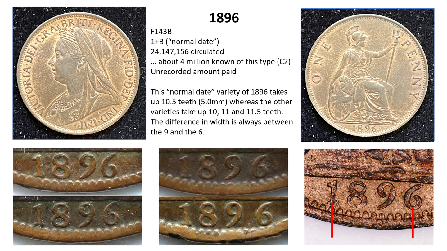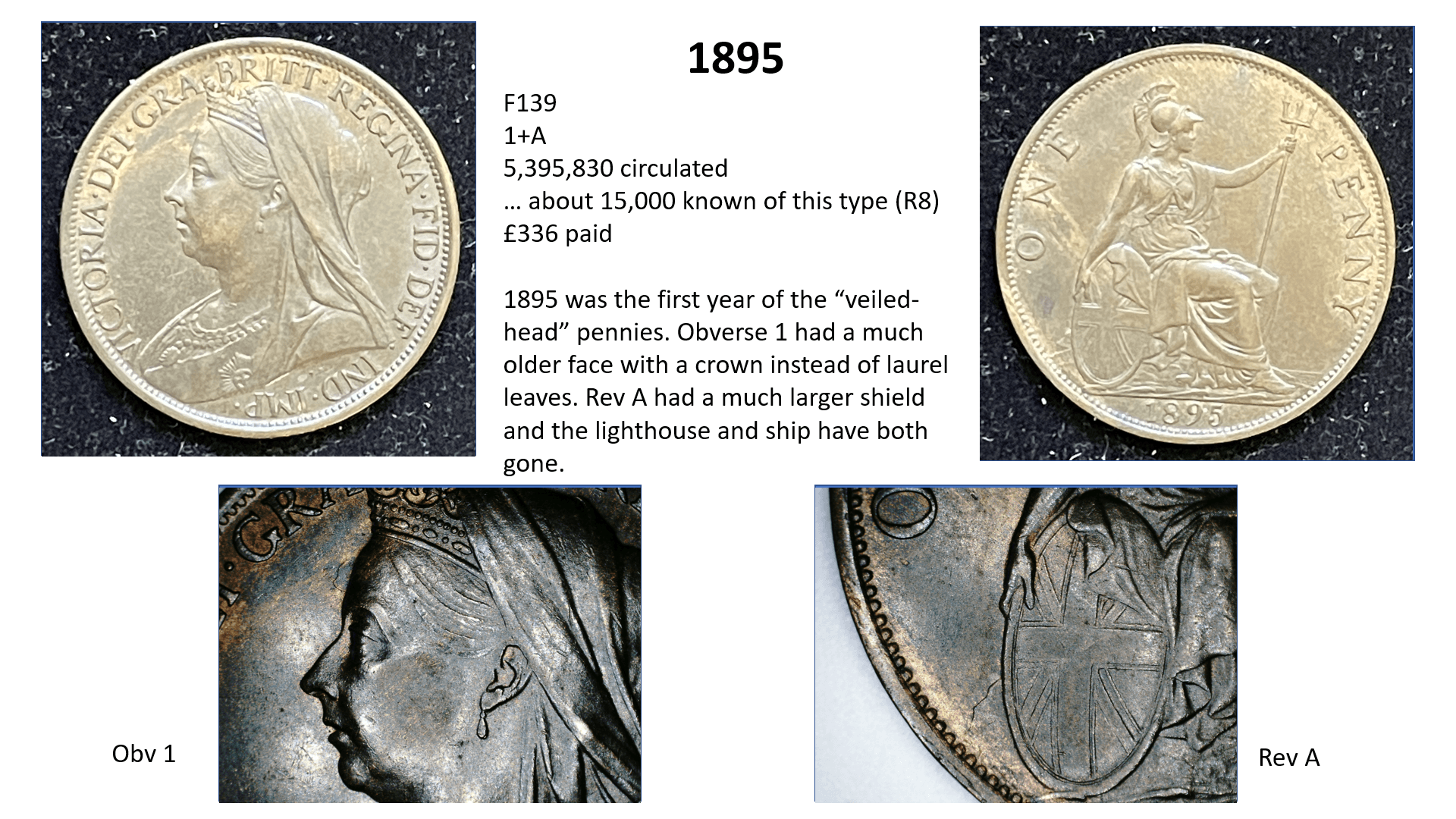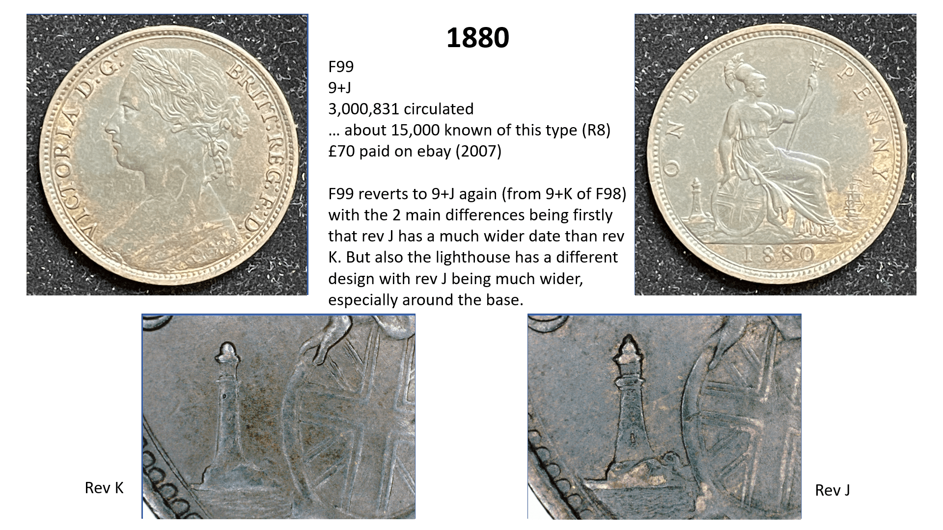 side of the penny (ie the date side). So for example, the 1860 pennies have 6 different types of obverse (1 to 6) and 6 different types of reverse (A to F) with many combinations of varieties therefore, but other years such as 1967 have only one variety (3+J). This gets even more complicated when some new variations are later discovered…….so for example in 1860 we have a 1*+A as well as a 1+A, but these do not occur often.