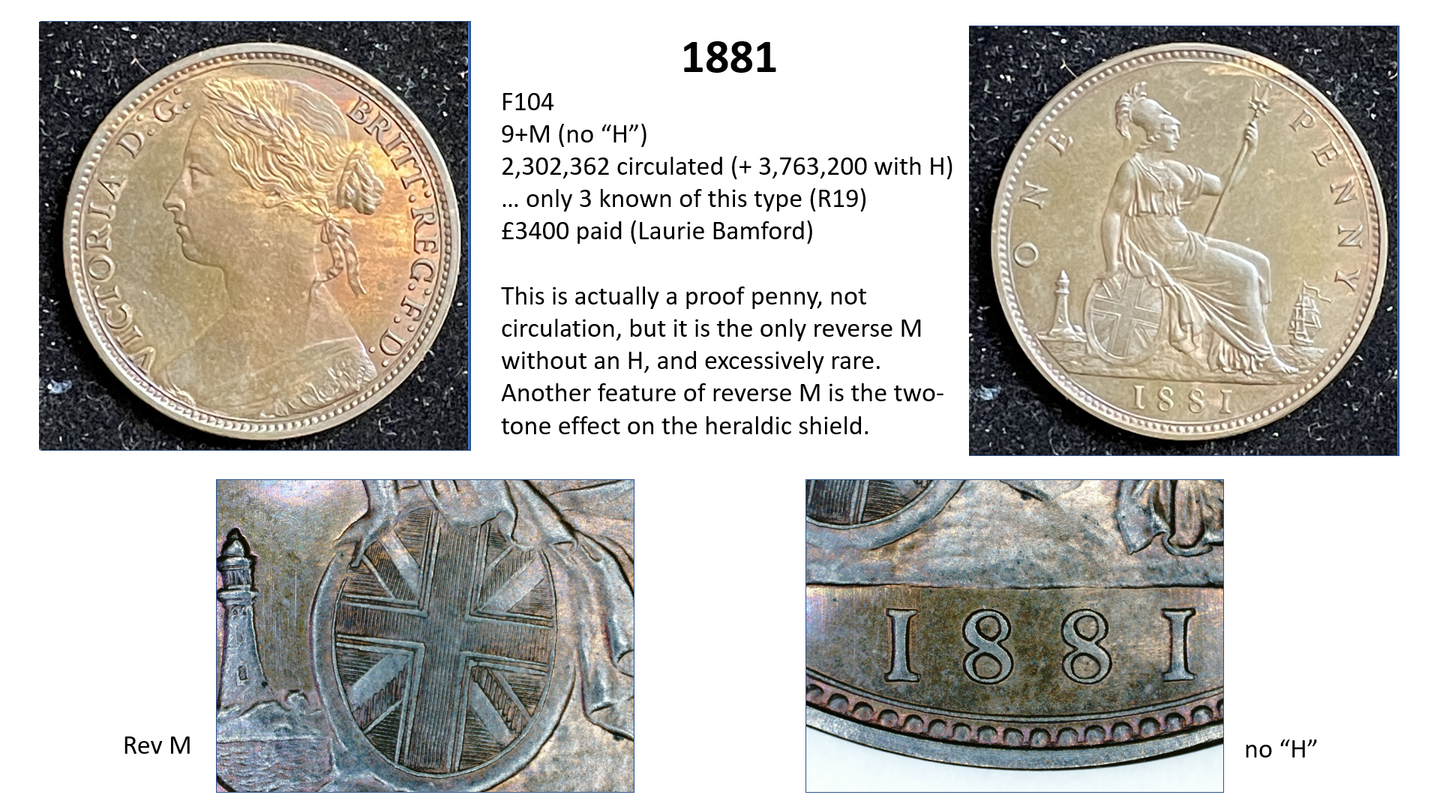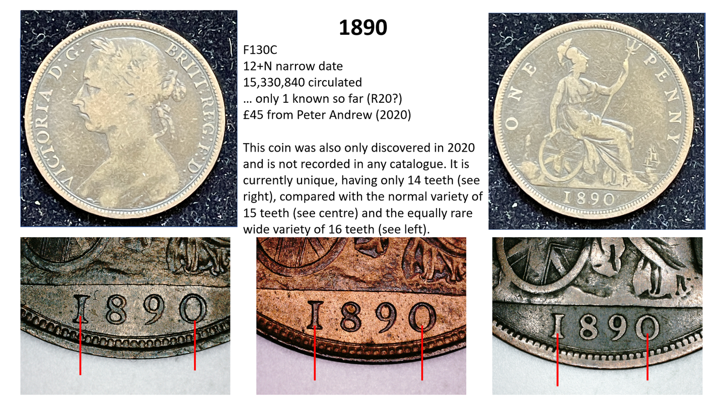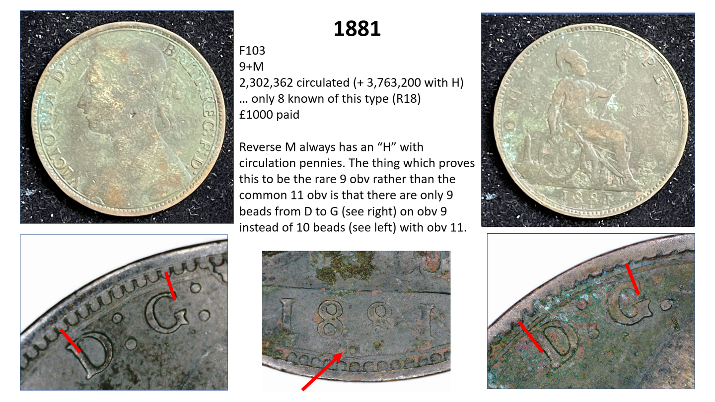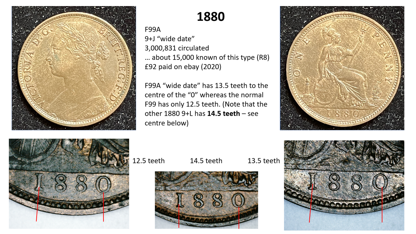 The circulation number is the total number of pennies minted – so for example in 1878 there were 2,764,470 pennies minted. A high percentage of these totals are either lost or melted down over the years. Thus, the total remaining for 1878 is estimated at only 25,000. The remainder no longer exist – in other words, only about 1% of the pennies minted are still around and 99% have gone. Moreover, no accurate records are kept as to how this total circulation figure is divided between the different varieties, so we have to make estimates. For example, the F1 penny (1860 1+A) is estimated at a total circulation of only around 1500 out of the 5 million+ total so it is given an R12 value, which is a guide to its rarity (C20 being the most common – over 100 million, and R20 being the scarcest being unique).