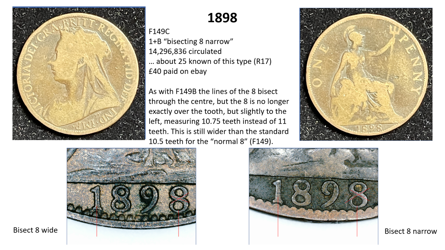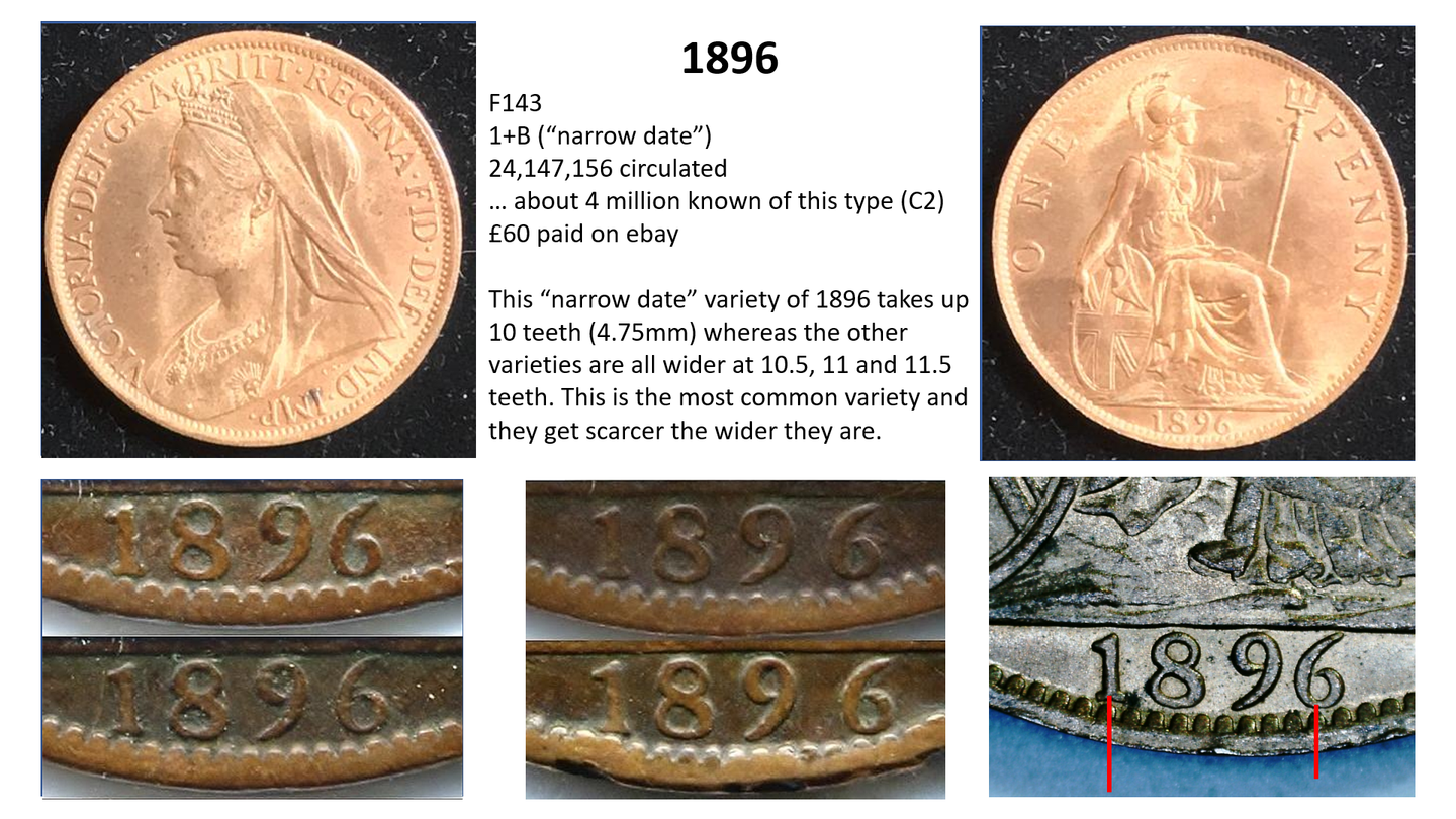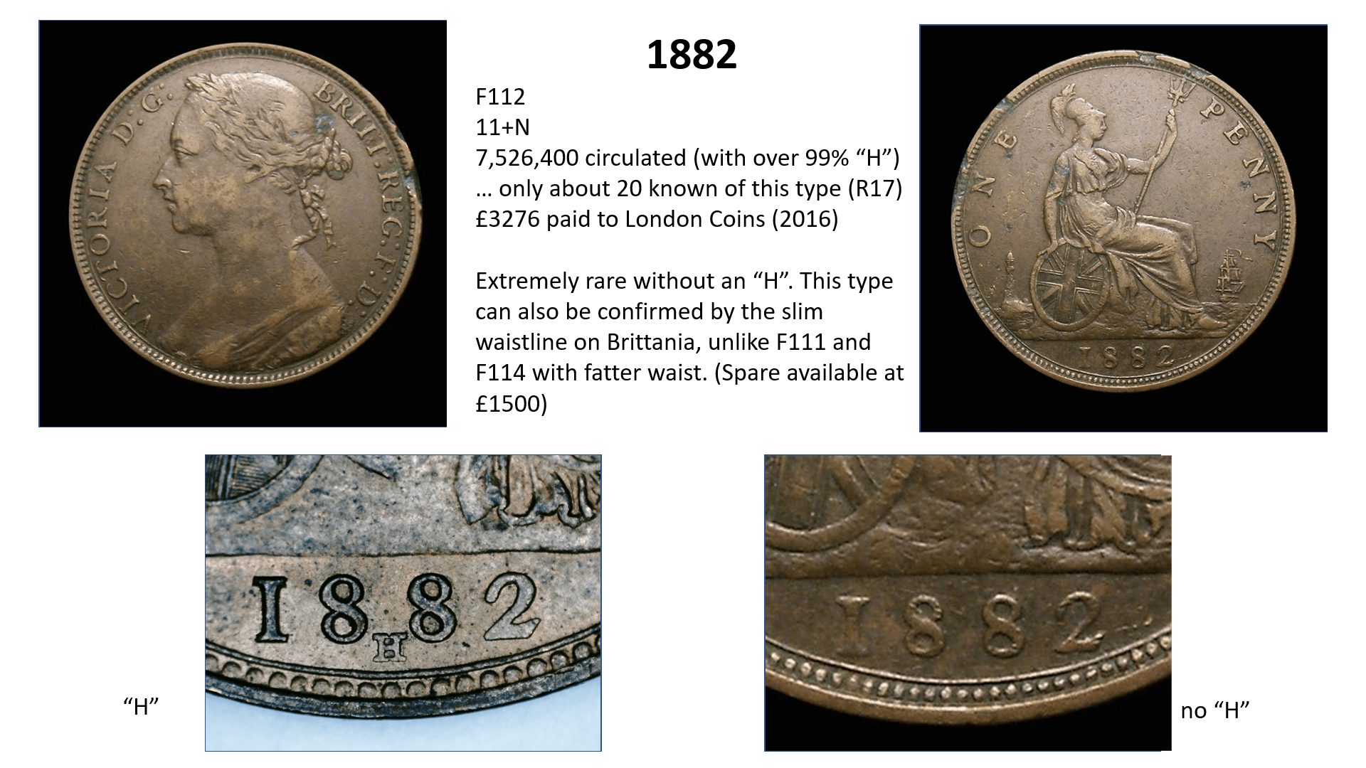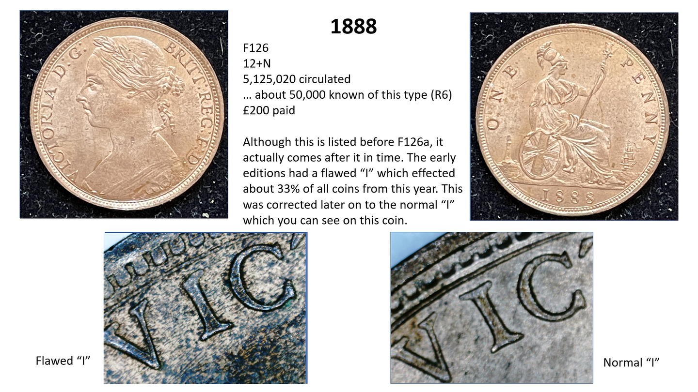 The circulation number is the total number of pennies minted – so for example in 1878 there were 2,764,470 pennies minted. A high percentage of these totals are either lost or melted down over the years. Thus, the total remaining for 1878 is estimated at only 25,000. The remainder no longer exist – in other words, only about 1% of the pennies minted are still around and 99% have gone. Moreover, no accurate records are kept as to how this total circulation figure is divided between the different varieties, so we have to make estimates. For example, the F1 penny (1860 1+A) is estimated at a total circulation of only around 1500 out of the 5 million+ total so it is given an R12 value, which is a guide to its rarity (C20 being the most common – over 100 million, and R20 being the scarcest being unique).